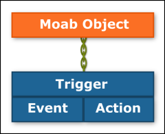 Moab triggers are configurable actions that respond to an event occurring on a Moab object. A trigger is attached to an object and consists of both an event that may take place on the object and the action that the trigger will take.