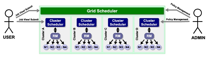 A grid enables you to exchange workload and resource status information and to distribute jobs and data among clusters in an established relationship. In addition, you can use resource reservations to mask reported resources, coordinate requests for consumable resources, and quality of service guarantees.