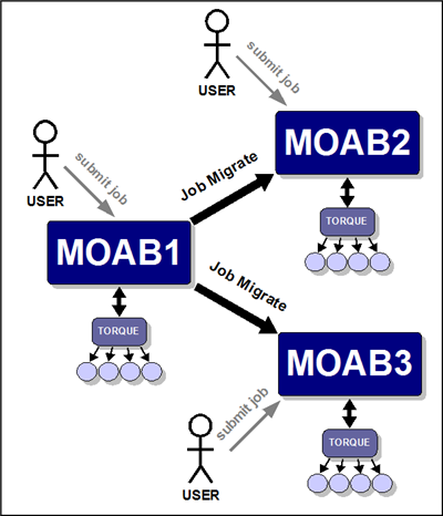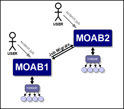 The localized management (peer-to-peer) model allows you to submit jobs on one cluster and schedule the jobs on the other cluster (it currently works with two clusters). For example, a job may be submitted on MOAB1 and run on MOAB2. Jobs can also migrate in the opposite direction (that is, from MOAB2 to MOAB1). The source servers running Moab obtain full resource information from both clusters and make intelligent scheduling decisions across both clusters. Jobs (and data when configured to do so) are migrated to other clusters as needed.