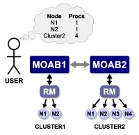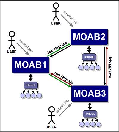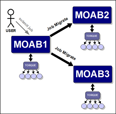 The localized management (peer-to-peer) model allows you to submit jobs on one cluster and schedule the jobs on another cluster. For example, a job may be submitted on MOAB1 and run on MOAB3. Jobs can also migrate in the opposite direction (that is, from MOAB3 to MOAB1). The source servers running Moab obtain full resource information from all clusters and make intelligent scheduling decisions across all clusters. Jobs (and data when configured to do so) are migrated to other clusters as needed.