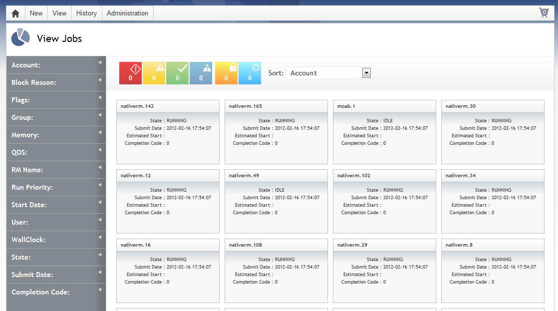 When you open the View Jobs page, tiles display representing each Moab job.