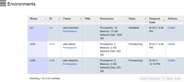 The Environments table lists all the environments in your system. Many of the columns in the Environments table can be sorted. Some of the columns contain items which can be clicked on to view additional information. For example, clicking on an item in the ID column takes you to the Environment Details page. Other columns with clickable items include Owner, VMs, and Actions.